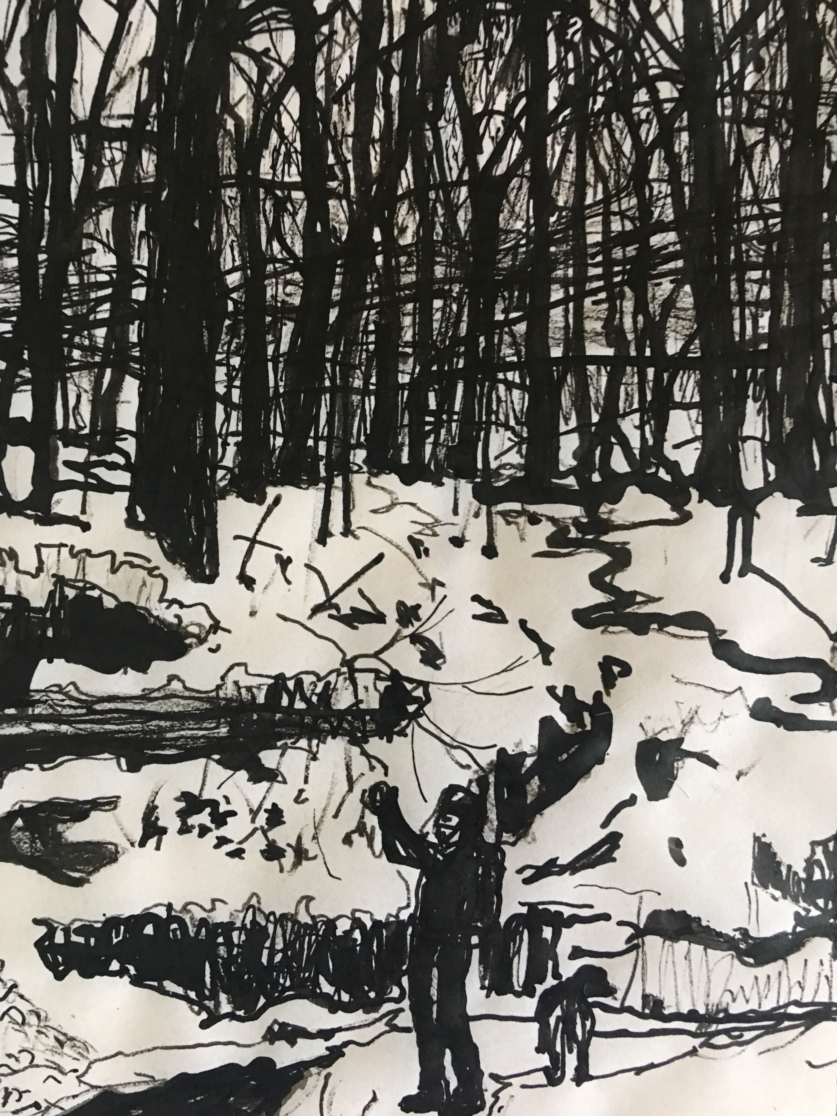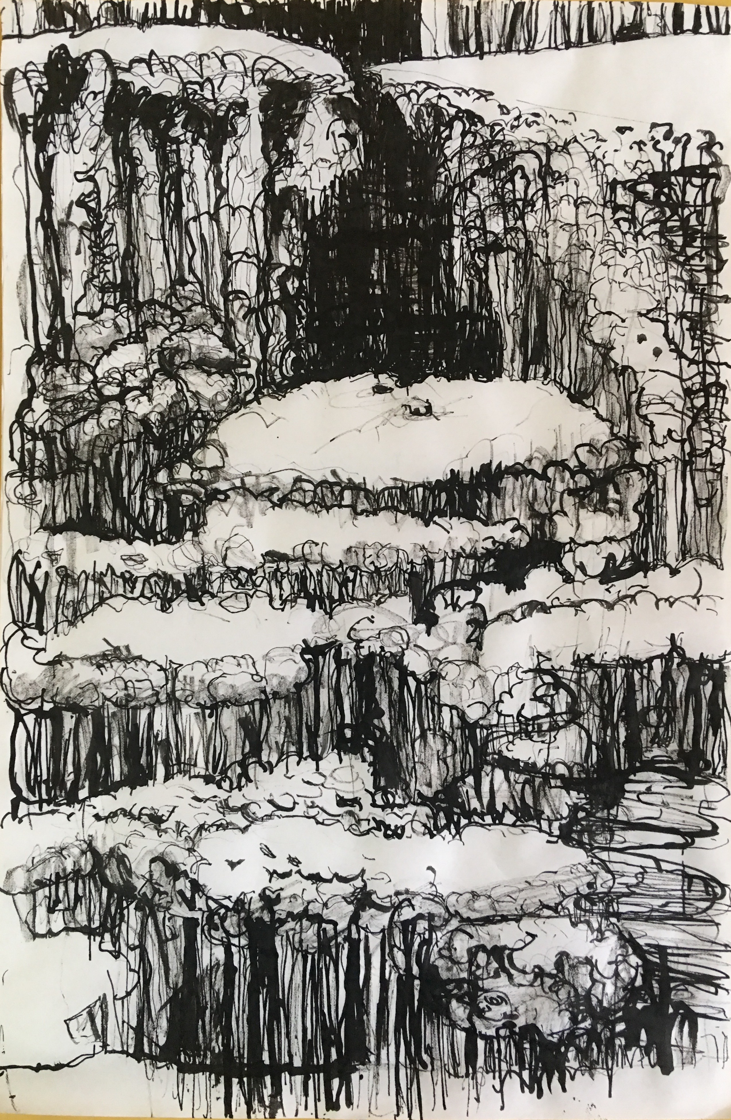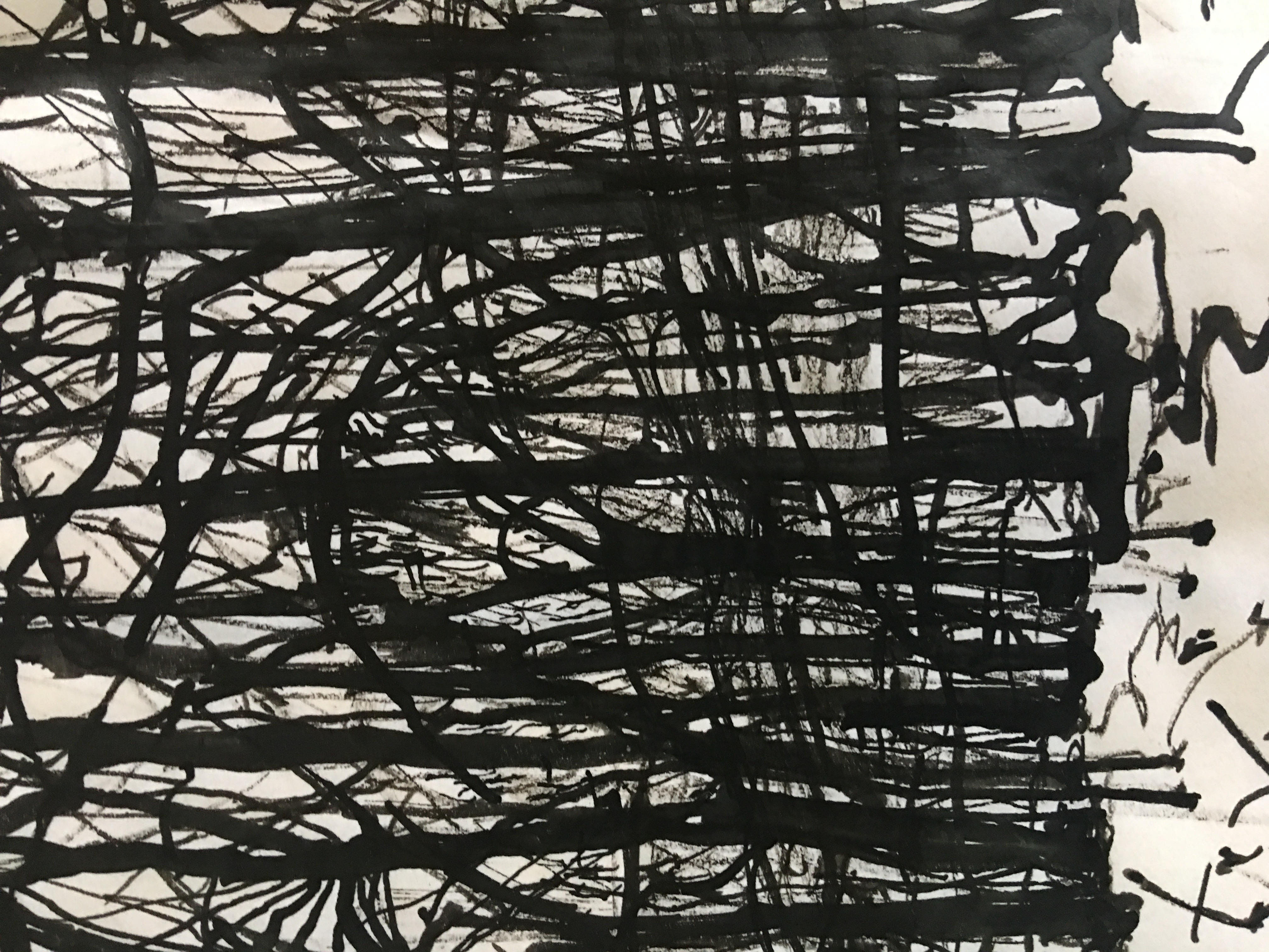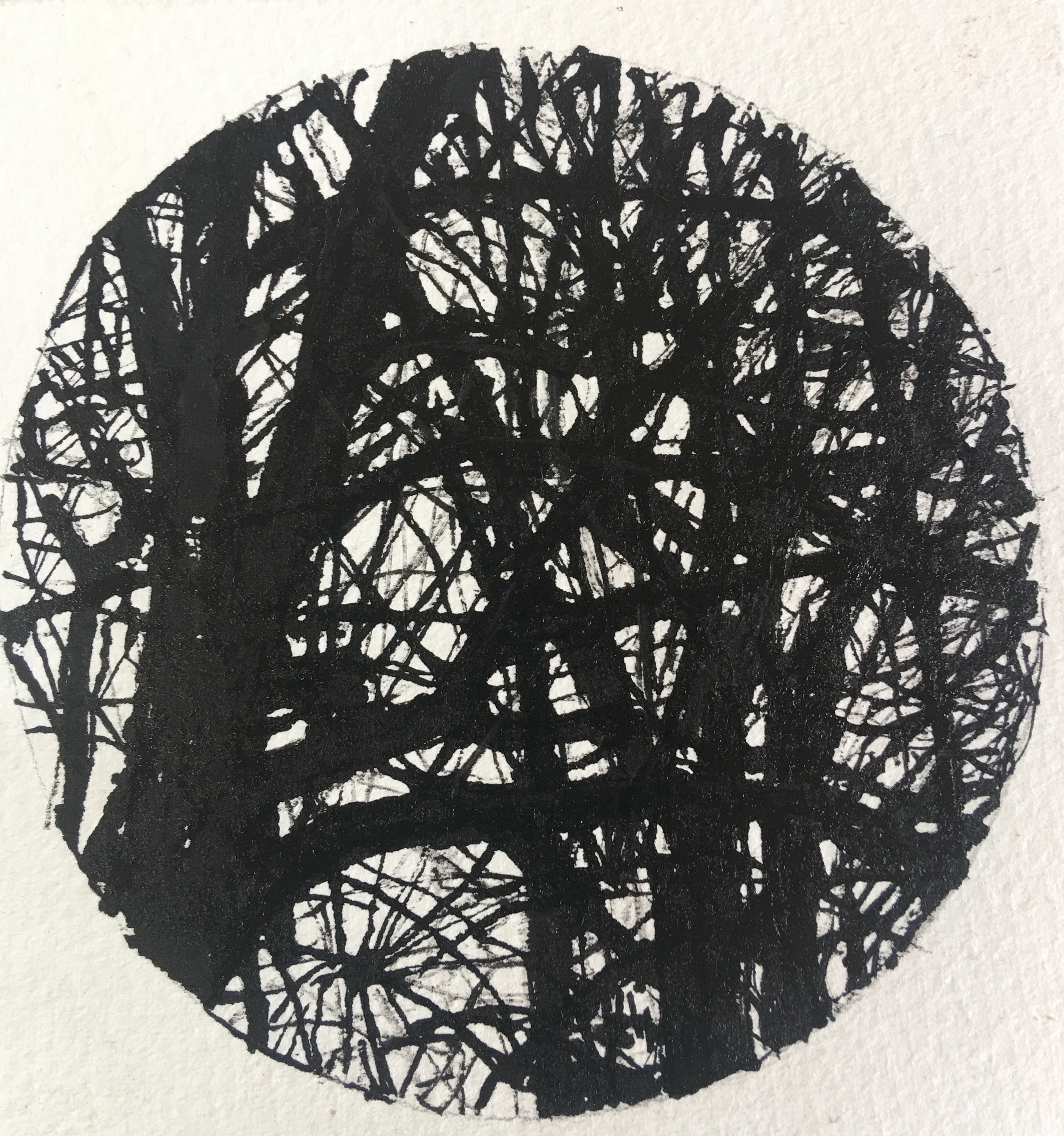 CROWS ON BRANCHES 2017, 14 x17" ink on np