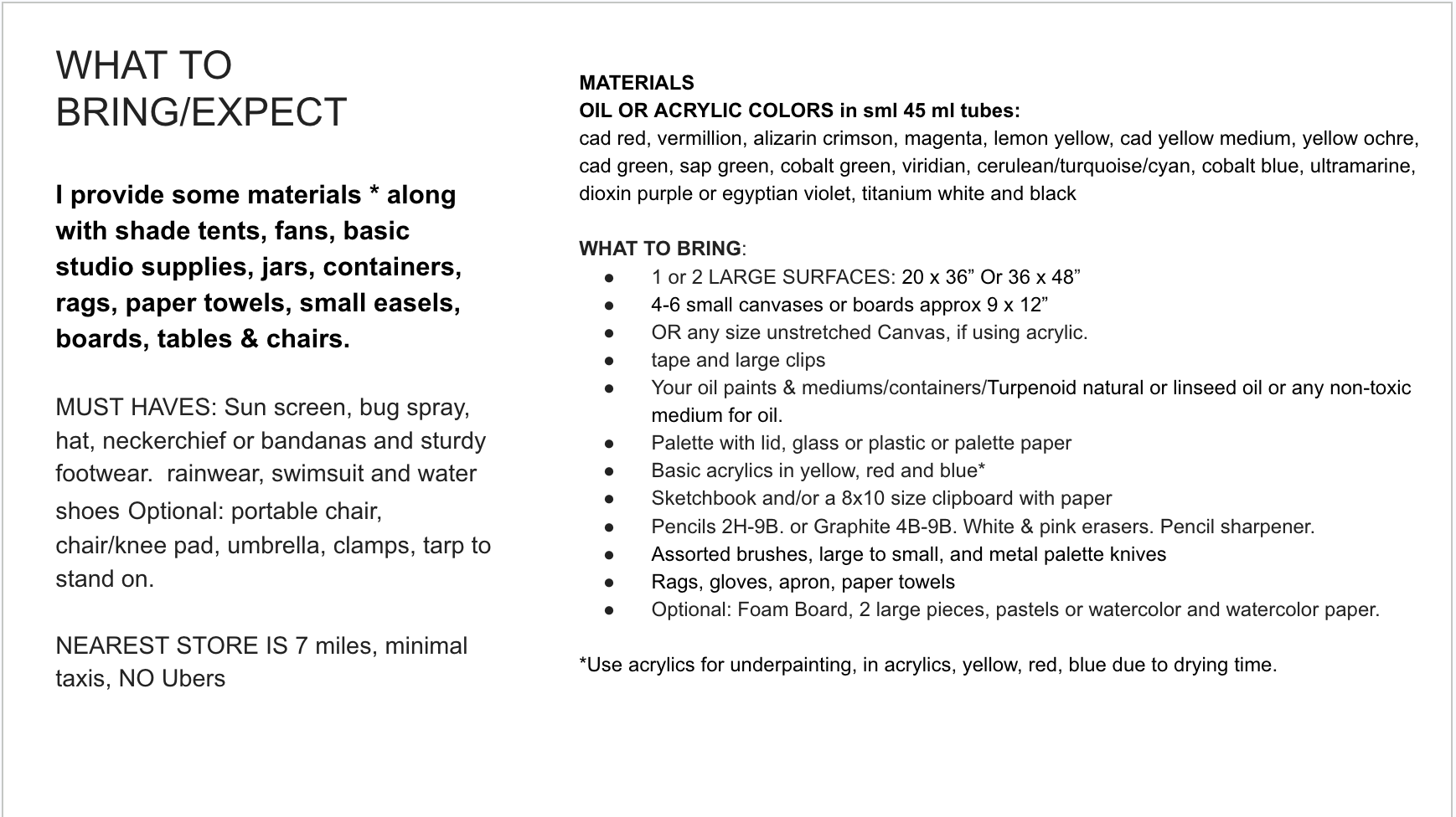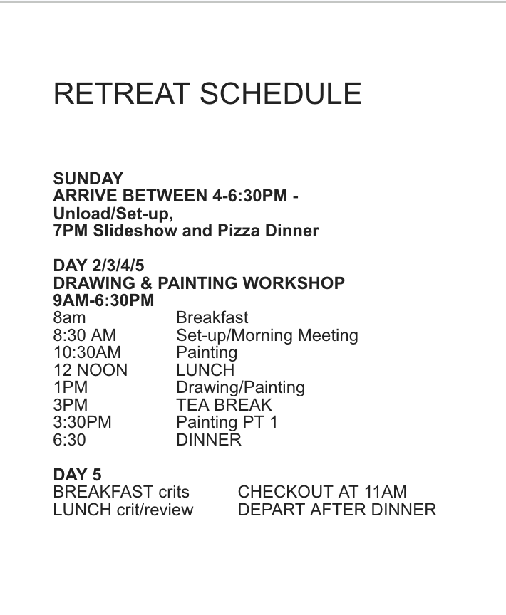 The cabin is stream side and shady. It will double as our plein-air studio and location, you will choose a spot and set-up for your 5 days of painting.